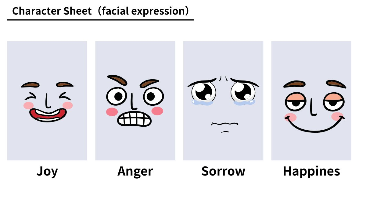 Karakter sayfası, yüz ifadeleri, neşe, öfke, üzüntü, mutluluk