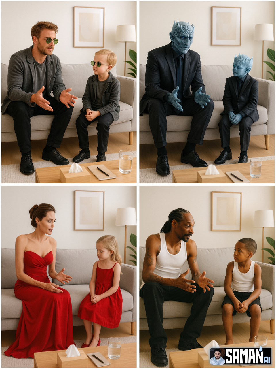 Aynı kişi iki yaşta yan yana oturuyor: solda yetişkin açık ellerle konuşuyor, sağda çocuk hafifçe başı öne eğik şekilde dinliyor.