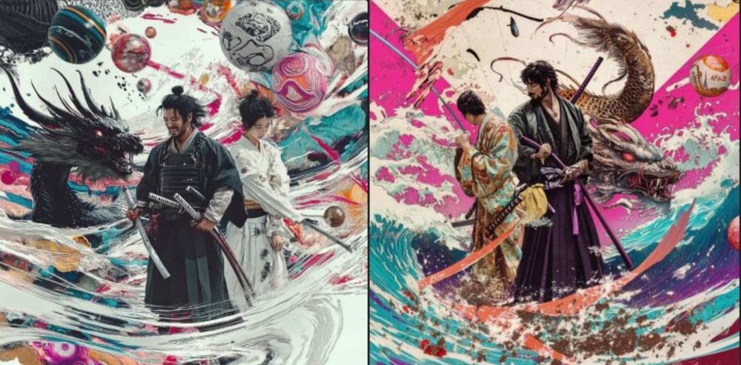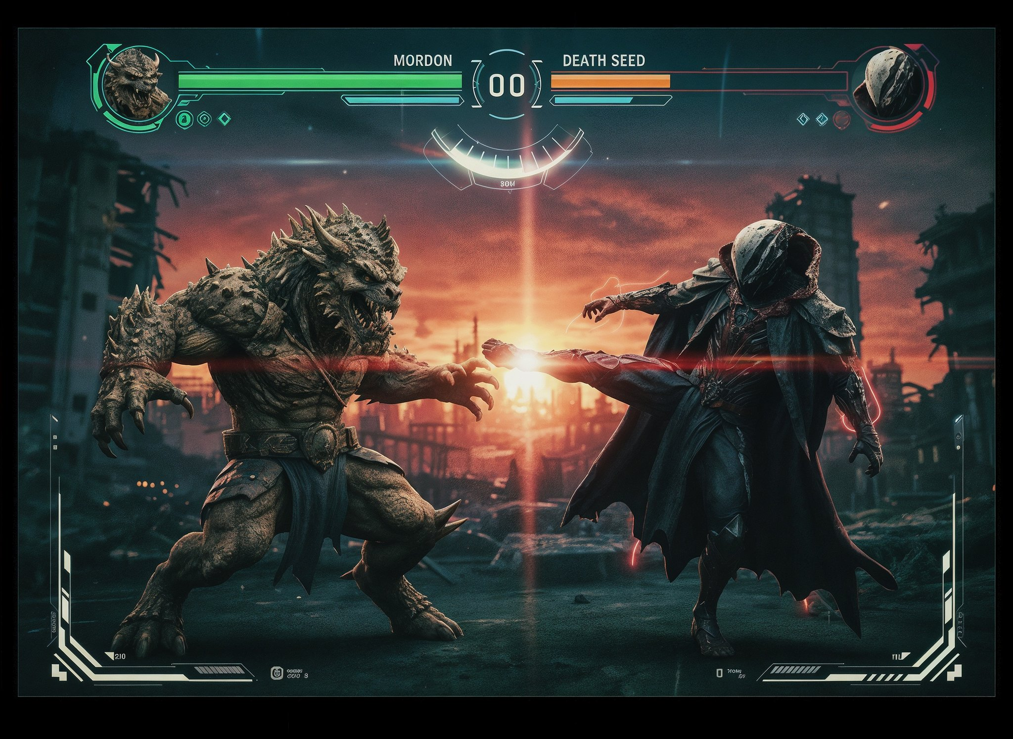 Bu iki karakterin Şekil 3'teki pozu kullanarak dövüşmesini sağlayın. Uygun görsel arka planlar ve sahne etkileşimleri ekleyin, Oluşturulan görüntü oranı 16:9'dur