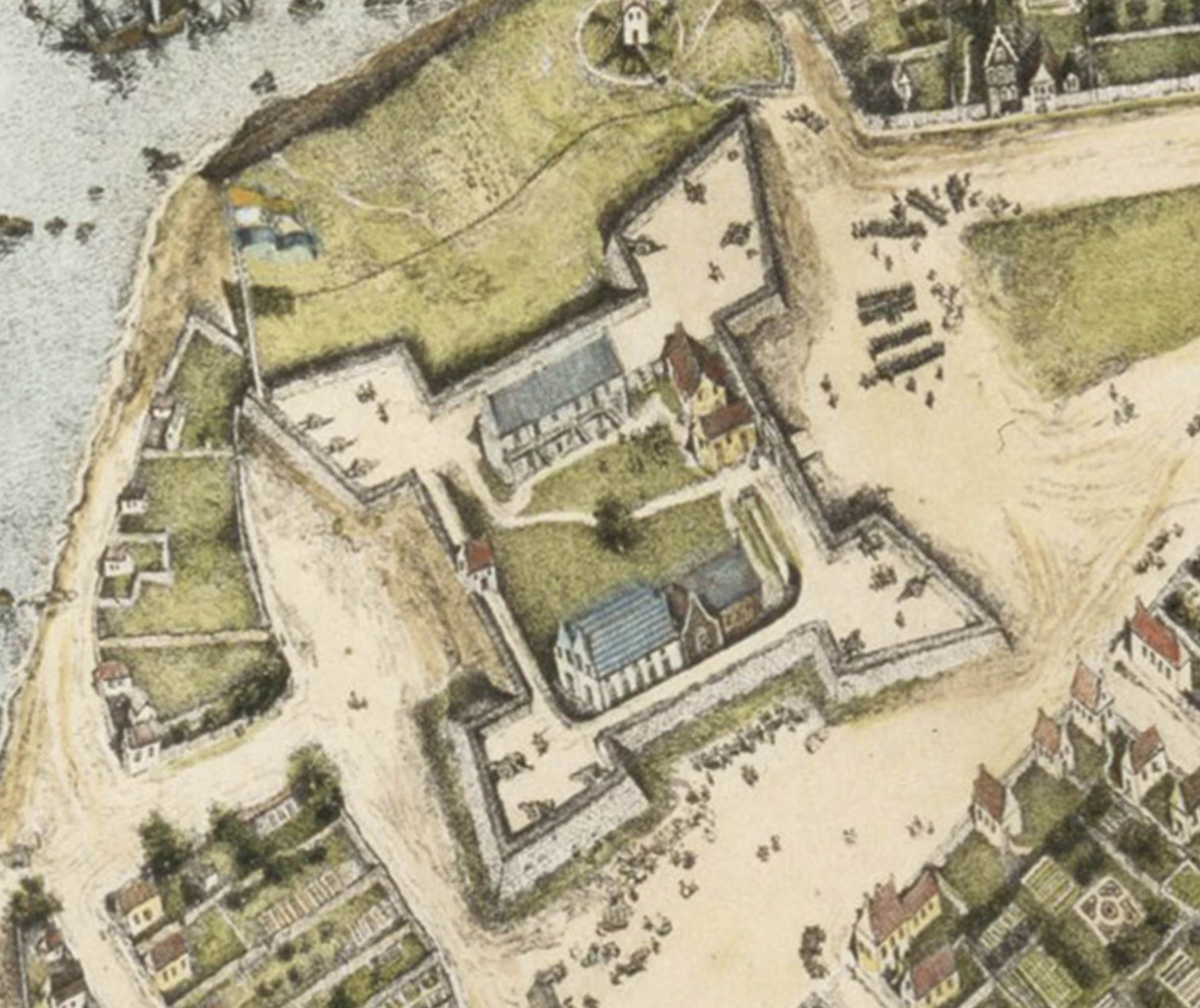 İki kişi yüzlerini dürbüne yaklaştırıp içeri bakmaya çalışıyor, her ikisi de yaramaz gülümsemelere sahip. Abartılı perspektif yüz hatlarını büyük ve kıvrımlı gösteriyor, yüzler objektife çok yakın.