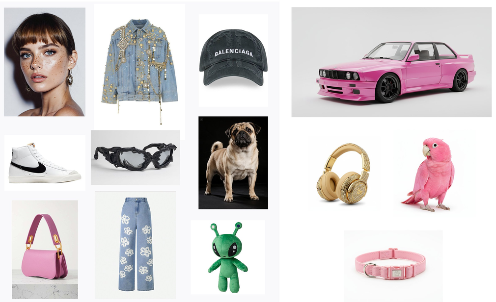 Bir model poz veriyor ve pembe bir bmw'ye yaslanıyor. Aşağıdaki eşyaları giyiyor, sahne açık gri bir arka plana karşı. Yeşil uzaylı bir anahtarlık ve pembe el çantasına takılı. Modelin omzunda pembe bir papağan da var. Yanında pembe tasmali ve altın kulaklıklı bir pug oturuyor.